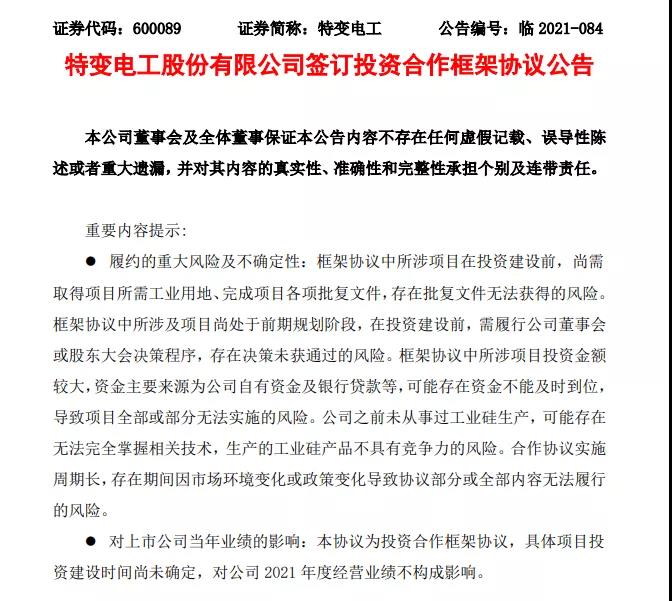 中國粉體網(wǎng)訊 11月5日,特變電工股份有限公司(以下簡稱“特變電工”)發(fā)布簽訂投資合作框架協(xié)議公告。