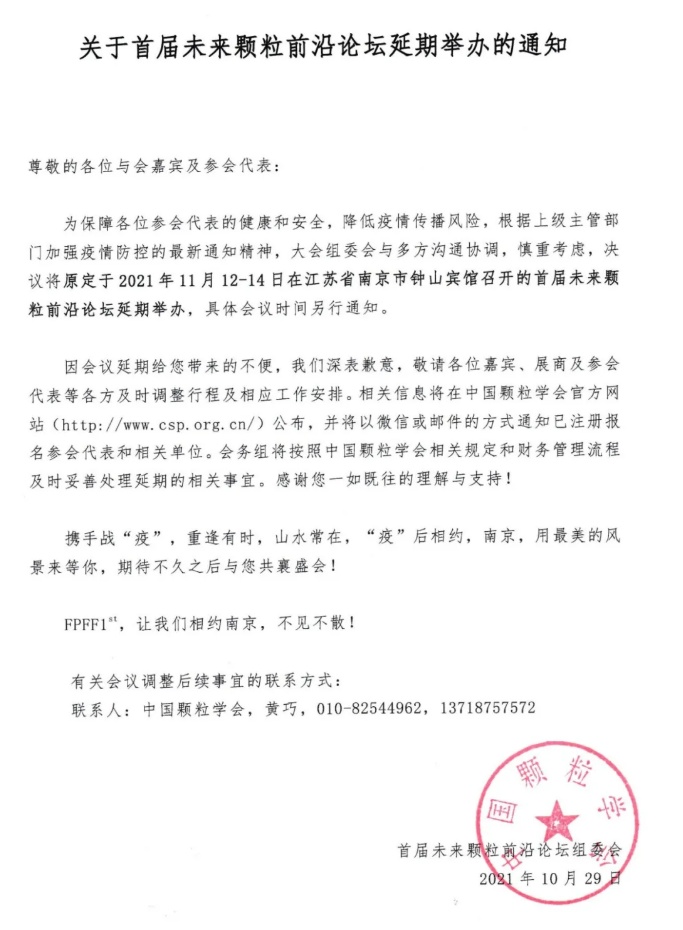 為保障各位參會(huì)代表的健康和安全,降低疫情傳播風(fēng)險(xiǎn),根據(jù)上級(jí)主管部門加強(qiáng)疫情防控的最新通知精神,大會(huì)組委會(huì)與多方溝通協(xié)調(diào),慎重考慮,決議將原定于2021年11月12-14日在江蘇省南京市鐘山賓館召開的首屆未來顆粒前沿論壇延期舉辦,具體會(huì)議時(shí)間另行通知。