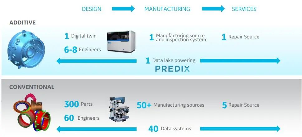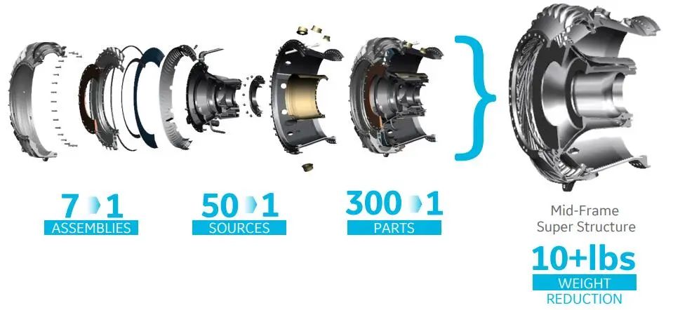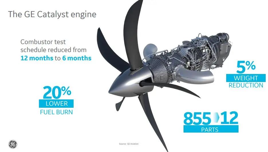 △GE Catalyst是世界上第一臺(tái)采用3D打印組件的渦輪螺旋槳發(fā)動(dòng)機(jī),新型的結(jié)構(gòu)設(shè)計(jì)因?yàn)?D打印降低了制造復(fù)雜性,它將此前通過(guò)傳統(tǒng)工藝制造的855個(gè)零件經(jīng)過(guò)結(jié)構(gòu)優(yōu)化減少為12個(gè)部件,零件數(shù)量的減少極大提高了生產(chǎn)效率,并將發(fā)動(dòng)機(jī)的重量減少了5%,燃油效率提高了1%,這顯示出3D打印集成制造優(yōu)勢(shì)。