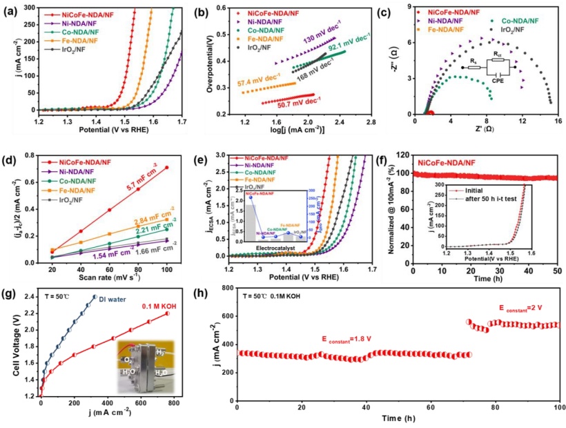 NiCoFe-NDA的水氧化性能以及在質(zhì)子交換膜水電解池中的性能驗證