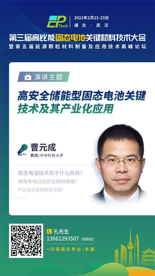 隨著技術(shù)的不斷成熟,固態(tài)鋰電池在高安全儲能領(lǐng)域有望獲得快速發(fā)展。2022年2月22-23日,由中國粉體網(wǎng)主辦的“第三屆高比能固態(tài)電池關(guān)鍵材料技術(shù)大會”將于湖北武漢東方建國大酒店舉辦,屆時將邀請來自華中科技大學的曹元成教授作《高安全儲能型固態(tài)電池關(guān)鍵技術(shù)及其產(chǎn)業(yè)化應(yīng)用》報告。報告人將介紹其團隊依托武漢新能源研究院和華中科技大學的平臺,主要針對智能電網(wǎng)對本征安全先進儲能技術(shù)的廣泛需求,開展高安全、高比能、長壽命固態(tài)電池關(guān)鍵材料的研發(fā)及產(chǎn)業(yè)化應(yīng)用,開發(fā)出一系列聚合物基復合型固態(tài)鋰電池,并且從關(guān)鍵材料制備、電芯組裝工藝、儲能模組集成等方面,初步實現(xiàn)了高安全儲能型固態(tài)鋰電池產(chǎn)業(yè)化應(yīng)用的突破,并定型了面向家用小型儲能和工業(yè)儲能的儲能系統(tǒng)產(chǎn)品,實現(xiàn)了從基礎(chǔ)研究到固態(tài)電池樣機驗證及儲能系統(tǒng)示范的全鏈條一體化設(shè)計與應(yīng)用。