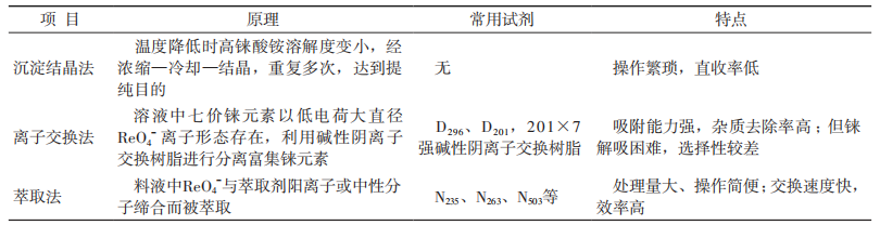 錸酸銨提純主要方法包括沉淀結(jié)晶法、離子交換法、萃取法等,其技術(shù)對比見下表。現(xiàn)在應(yīng)用較多的提純技術(shù)主要有離子交換法和萃取法。