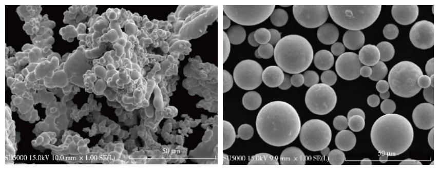 等離子球化是將金屬原料粉末通入氬氣及氫氣形成的等離子體焰流中進行熔化整形的工藝。等離子球化工藝不僅可以顯著提升粉末球形度,而且可以提高粉末純度。下圖為錸粉等離子球化處理前后形貌對比。球形錸粉可用于3D打印。