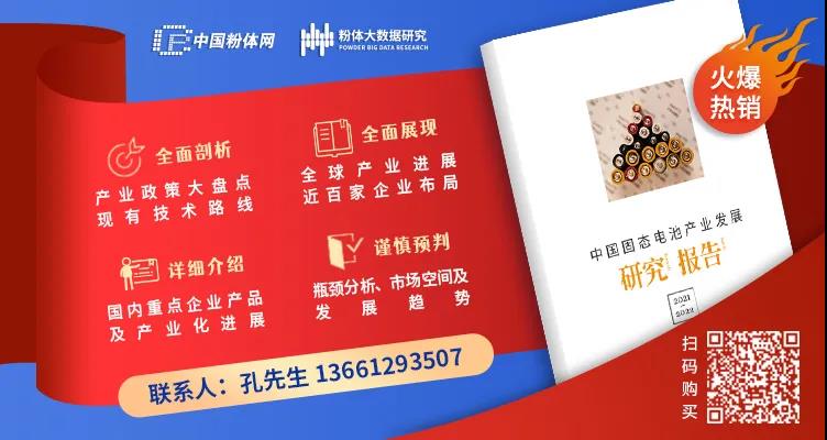 固態(tài)鋰電池因其在技術(shù)和性能方面的優(yōu)勢(shì),極有可能成為液態(tài)電池之后電動(dòng)車企的主流選擇。在此背景下,為幫助企業(yè)更全面系統(tǒng)了解固態(tài)電池技術(shù)與產(chǎn)業(yè)發(fā)展現(xiàn)狀,把握產(chǎn)業(yè)未來發(fā)展趨勢(shì),中國(guó)粉體網(wǎng)旗下粉體大數(shù)據(jù)研究通過對(duì)全國(guó)主要?jiǎng)恿﹄姵仄髽I(yè)、鋰電材料企業(yè)以及整車企業(yè)進(jìn)行調(diào)研,結(jié)合固態(tài)電池行業(yè)領(lǐng)軍人物的專訪、演講及院士專家的觀點(diǎn),收集大量的產(chǎn)業(yè)數(shù)據(jù)、權(quán)威報(bào)道和技術(shù)文獻(xiàn)資料等,推出《中國(guó)固態(tài)電池產(chǎn)業(yè)發(fā)展研究報(bào)告(2021-2022)》。