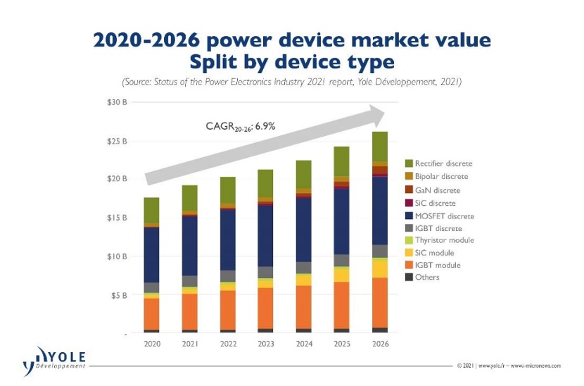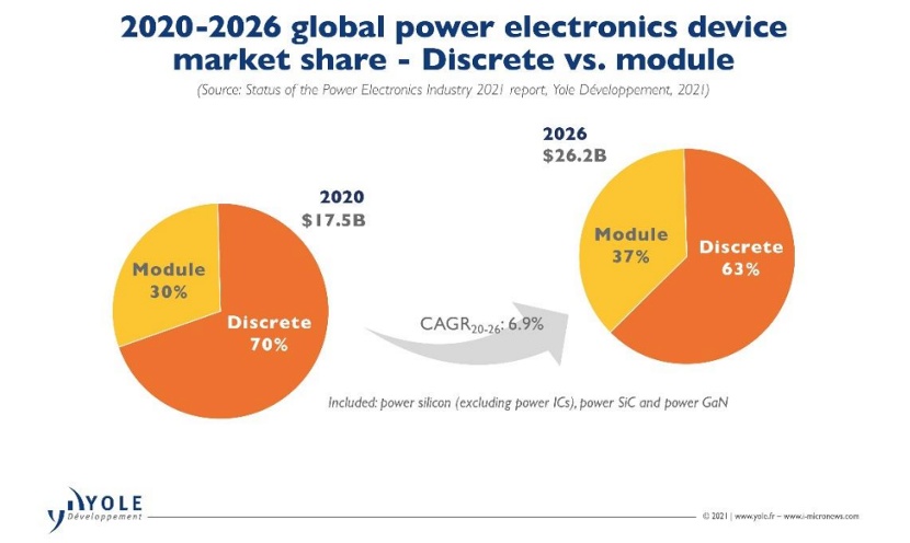中國粉體網(wǎng)訊 近日,Yole Développement (Yole) 發(fā)表了關(guān)于功率模塊封裝市場的分析。Yole功率半導(dǎo)體活動(dòng)團(tuán)隊(duì)首席分析師 Ana Villamor 博士在文中表示,隨著全球制定“碳達(dá)峰、碳中和”目標(biāo),帶來更多綠色能源發(fā)電、綠色汽車、充電樁、儲(chǔ)能等需求,功率半導(dǎo)體器件市場將從2020年的175億美元,增長至2026年的260億美元,年均復(fù)合增長率達(dá)6.9%。