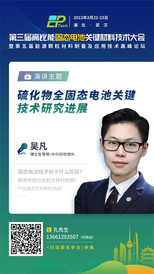 實(shí)現(xiàn)高比能硫化物全固態(tài)電池的實(shí)際生產(chǎn)與應(yīng)用,硫化物固態(tài)電池仍面臨許多問題需要克服。2022年2月22-23日,由中國粉體網(wǎng)主辦的“第三屆高比能固態(tài)電池關(guān)鍵材料技術(shù)大會(huì)”將于湖北武漢東方建國大酒店舉辦,屆時(shí)將邀請(qǐng)來自中科院物理所的吳凡教授作《硫化物全固態(tài)電池關(guān)鍵技術(shù)研究進(jìn)展》報(bào)告。本報(bào)告主講人將重點(diǎn)關(guān)注硫化物全固態(tài)電池的關(guān)鍵基礎(chǔ)科學(xué)問題和應(yīng)用化開發(fā)難題,探討團(tuán)隊(duì)在此領(lǐng)域的研發(fā)進(jìn)展。