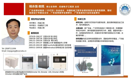 楊永強教授在增材制造(3D打印)、激光材料加工、焊接裝備與工藝等方面做了大量的研究工作,成功研制出國內第一臺激光選區(qū)熔化(SLM)快速成型機,實現了金屬零件的直接快速成型制造,并將數字化、網絡化、個性化、定制化為特點的金屬3D打印技術應用在醫(yī)學領域中。