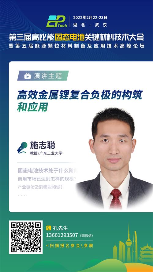 充放電過程中鋰枝晶和界面副反應(yīng)是導(dǎo)致金屬鋰電池安全性差和庫倫效率低的主要原因。針對鋰金屬負(fù)極存在的問題,2022年2月22-23日,由中國粉體網(wǎng)主辦的“第三屆高比能固態(tài)電池關(guān)鍵材料技術(shù)大會”將于湖北武漢東方建國大酒店舉辦,屆時(shí)將邀請來自廣東工業(yè)大學(xué)的施志聰教授作《高效金屬鋰復(fù)合電極的構(gòu)筑和應(yīng)用》報(bào)告。報(bào)告主講人從三維集流體的表界面工程以及人工SEI膜構(gòu)筑兩個(gè)角度開展了一系列研究,主要包括:1)在泡沫鎳、碳布骨架表面均勻修飾準(zhǔn)單層親鋰AuLi3位點(diǎn)抑制鋰枝晶生長;2)在泡沫銅骨架表面構(gòu)建亞微米多孔銅鋅合金與熱偏析親鋰納米鋅位點(diǎn)協(xié)同抑制鋰枝晶生長;3)原位構(gòu)筑海藻酸鋰等鋰離子固態(tài)電解質(zhì)界面層用于穩(wěn)定鋰金屬負(fù)極;谝陨细男圆呗裕嚱饘儇(fù)極的電化學(xué)性能獲得極大提升。