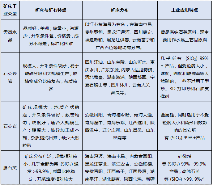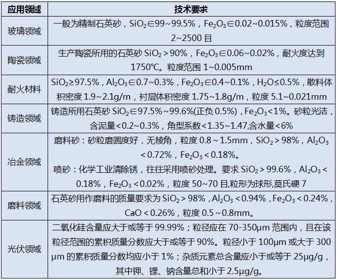 由于不同礦床工業(yè)類型的形成地質條件不同,使石英的礦床規(guī)模大小、礦石組成結構以及石英的晶體結構、晶體化學、粒度、球度和圓度等都存在較大差別。因此,石英礦床工業(yè)類型與工業(yè)應用特點有著密切的關系,不同的礦床工業(yè)類型的石英有不同的應用特點。