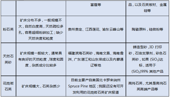 與其他非金屬礦相比,石英礦物原料工業(yè)應用的一個顯著特點是同時存在三種形式:一是利用礦物晶體固有的物理和物理化學性質,如3D打印砂、結晶硅微粉等;二是提供有用化學成分,也是硅酸鹽材料的最基本原料,包括普通玻璃及各類功能玻璃等;三是通過冶金渠道提取有用元素Si,目前是金屬硅及其提純加工產物多晶硅和單晶硅的唯一原料。