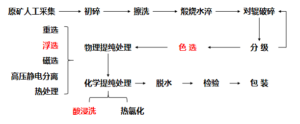 目前,工業(yè)上成熟應用的石英提純傳統(tǒng)工藝有分選、擦洗、煅燒-水淬、磨礦、篩分、磁選、重選、浮選、酸浸、高溫脫氣等,深度提純工藝有氯化焙燒、輻照色選、超導磁選、高溫真空等等。張教授表示高端用途用石英的選礦提純是比較完整的、流程較長,往往會用到所有的選礦提純方法,需通過每個工藝節(jié)點去除一部分雜質,最終達到高純的技術要求。但依然是原料的選擇、石英原料的礦物學特征決定具體的選礦提純工藝條件、流程。