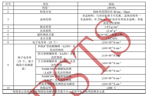 表 1 固態(tài)鋰電池用無(wú)機(jī)氧化物固態(tài)電解質(zhì)粉體的技術(shù)參數(shù)指標(biāo)要求
