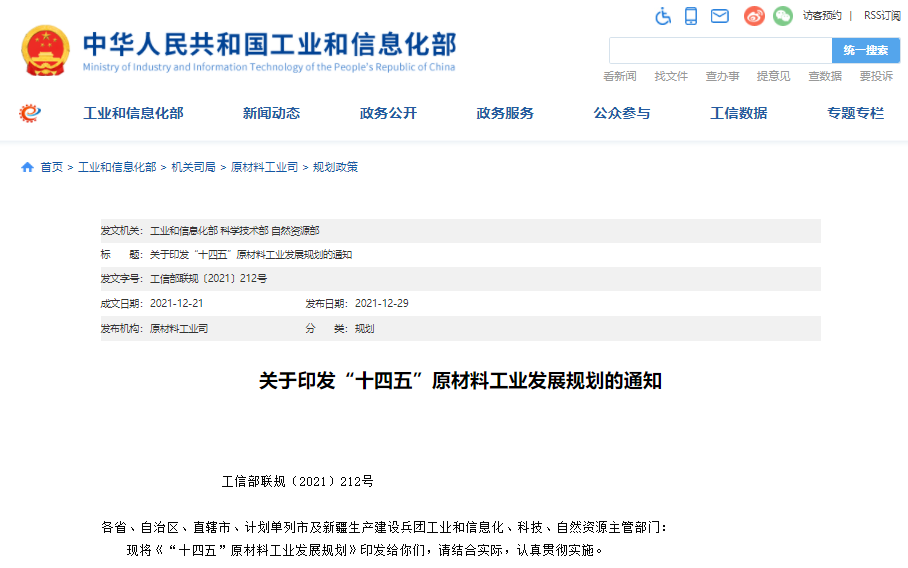 工信部《“十四五”原材料工業(yè)發(fā)展規(guī)劃》文件