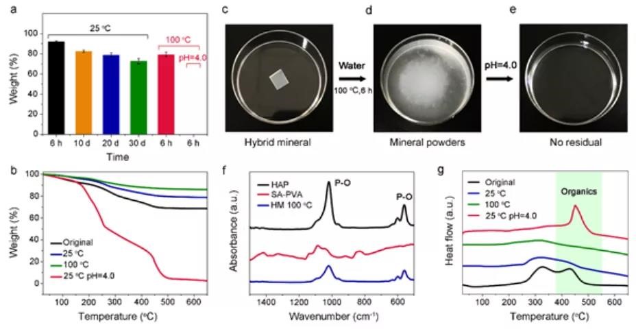 HMs的主要組分均具有良好的環(huán)境友好性和可生物降解性。簡單地將樣品浸入水中模擬了HM降解的自然條件。30天時,HMs中的有機物大多通過簡單的水處理被溶解,其余塊體幾乎為純CaP礦物相。隨著溫度的升高,這種有機溶解過程加快,在100℃時,HM在6h內(nèi)逐漸分解成粉末。