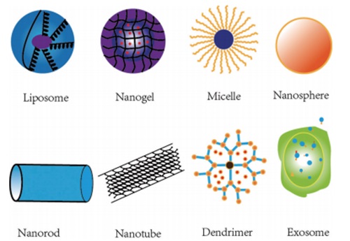 將脂質(zhì)體、納米凝膠、聚合物膠束等納米載體與藥物相結(jié)合,可制備納米藥物,不同納米載體的結(jié)構(gòu)示意圖如下圖。Bi等利用轉(zhuǎn)鐵蛋白偶脂質(zhì)體負(fù)載蟲草素,增加了肝癌細(xì)胞對(duì)蟲草素的內(nèi)吞,通過促進(jìn)活性氧的產(chǎn)生,誘導(dǎo)肝癌細(xì)胞凋亡。Pacardo等以多功能納米金棒為載體,在紫外線和紅外線的雙重照射下可協(xié)同殺傷宮頸癌細(xì)胞。Mehra等制備的負(fù)載阿霉素的多壁碳納米管TPGS-MWCNTs,可通過內(nèi)吞機(jī)制殺傷腫瘤細(xì)胞,延長(zhǎng)藥物在體內(nèi)的滯留時(shí)間。有研究將樹突狀大分子與血管內(nèi)皮生長(zhǎng)因子抗體Flt-1相結(jié)合,負(fù)載吉西他濱,可高度靶向小鼠胰腺癌細(xì)胞,增加了藥物在腫瘤組織中的富集。Zhang等將siRNA與外泌體相結(jié)合,可顯著下調(diào)HGF的表達(dá),抑制腫瘤血管的生長(zhǎng)。