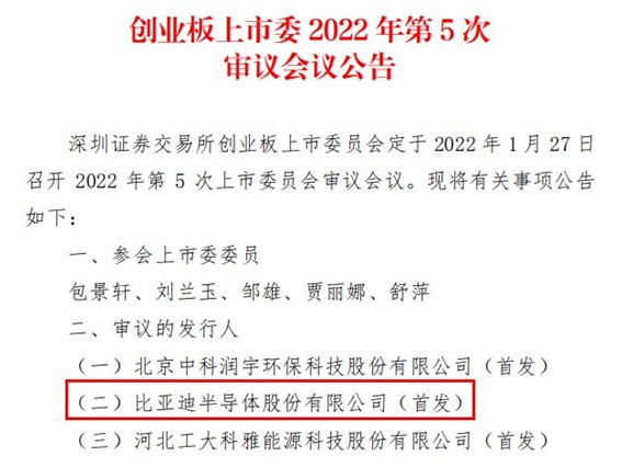 中國粉體網(wǎng)訊 據(jù)深交所網(wǎng)站消息,創(chuàng)業(yè)板上市委員會(huì)定于2022年1月27日召開2022年第5次上市委員會(huì)審議會(huì)議,屆時(shí)將審議比亞迪半導(dǎo)體股份有限公司的首發(fā)事項(xiàng)。同日,比亞迪半導(dǎo)體也已同步發(fā)布該消息的公告。