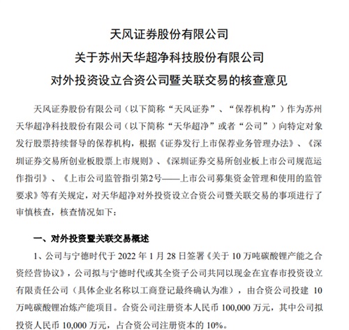 1、天華超凈再度牽手寧德時(shí)代,合資投建10萬噸碳酸鋰