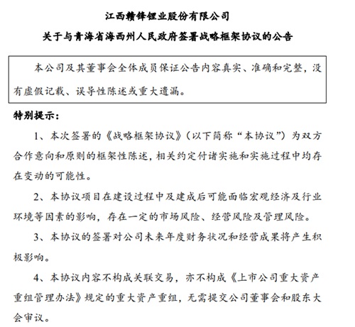 2、贛鋒鋰業(yè)與海西州人民政府簽署戰(zhàn)略框架協(xié)議