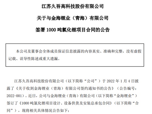 2022年1月4日,江蘇久吾高科技股份有限公司披露了《關(guān)于收到金海鋰業(yè)(青海)有限公司簽約通知書的公告》。據(jù)悉,金海鋰業(yè)系上市公司惠州億緯鋰能股份有限公司的控股子公司。
