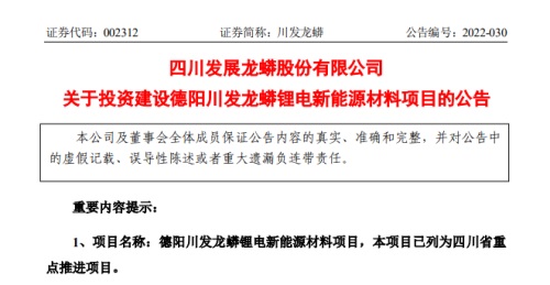 2021年11月19日,川發(fā)龍蟒與德陽-阿壩生態(tài)經(jīng)濟(jì)產(chǎn)業(yè)園區(qū)管理委員會簽署了投資框架協(xié)議。2022年2月21日,經(jīng)公司第六屆董事會第十六次會議審議通過,同意以全資子公司德陽川發(fā)龍蟒新材料有限公司為主體,在四川省綿竹市德阿產(chǎn)業(yè)園投資120億元建設(shè)德陽川發(fā)龍蟒鋰電新能源材料項目。