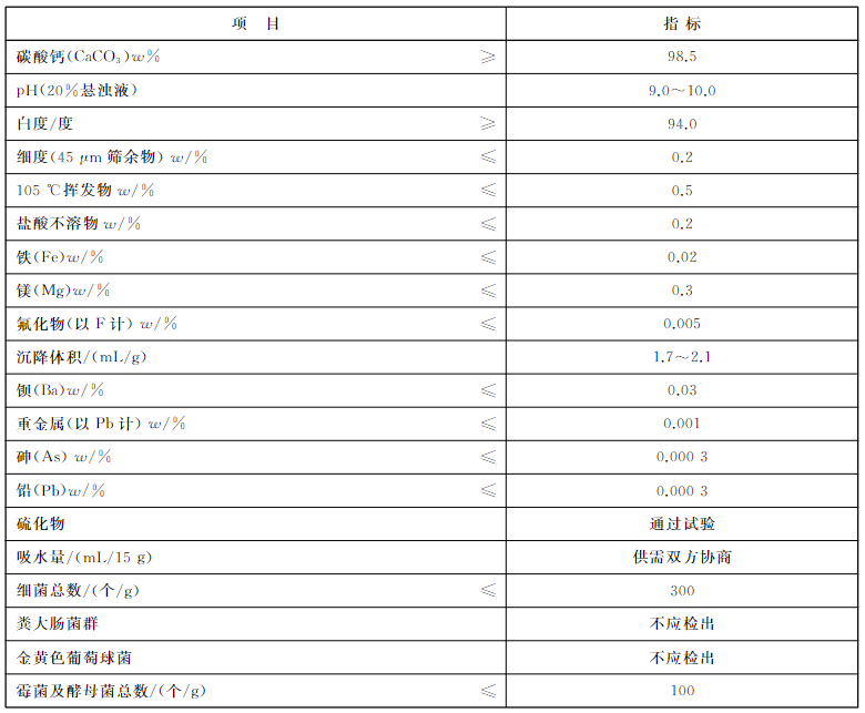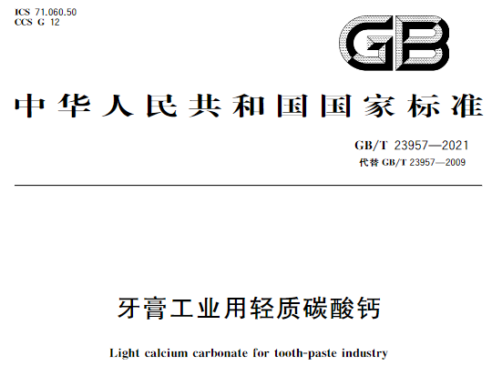 GB/T 23957-2021《牙膏工業(yè)用輕質(zhì)碳酸鈣》規(guī)定了牙膏工業(yè)用輕質(zhì)碳酸鈣的要求、試驗(yàn)方法、檢驗(yàn)規(guī)則、標(biāo)志、標(biāo)簽、包裝、運(yùn)輸和貯存。除了外觀要求白色或灰白色粉末,其他具體指標(biāo)有以下要求: