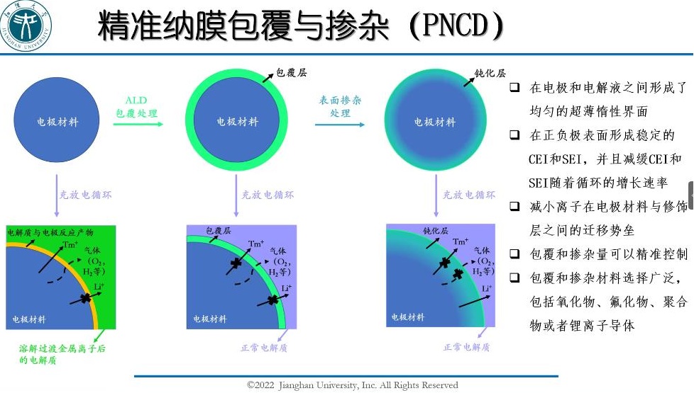 李煜宇博士在報告中探討了精準納膜包覆與摻雜技術(PNCD)在高電壓鈷酸鋰(4.5V), 高壓(4.4~4.5V)中鎳三元(532和622),中壓(4.2~4.3V)高鎳三元(811和NCA),以及石墨負極和固態(tài)電池中的應用。