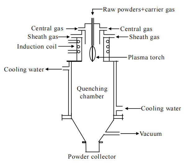 等離子體球化技術(shù)是在高溫等離子體中載入粉末,高溫環(huán)境促使粉末顆粒吸熱熔融,粉末在表面張力的作用下縮聚為球形液滴,而后在冷卻室中快速冷凝為球形粉末。