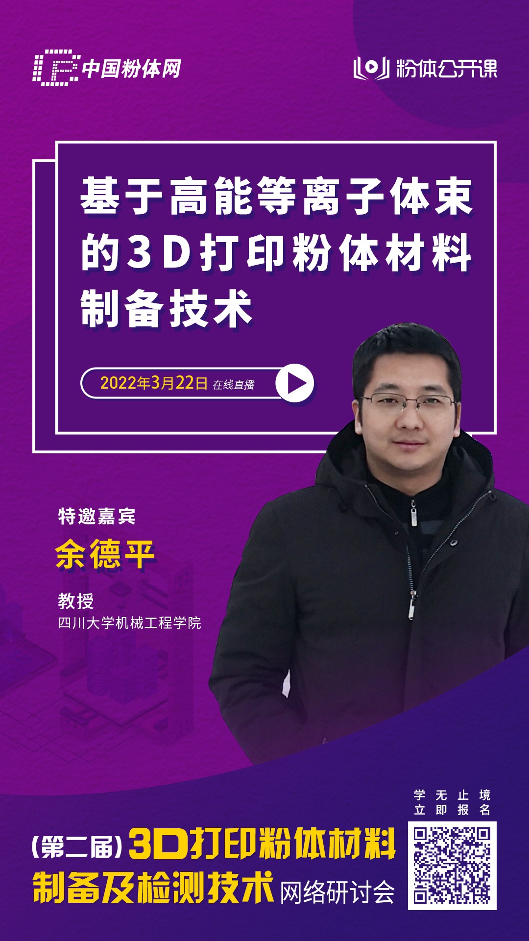 2022年3月22日,中國粉體網(wǎng)旗下粉體公開課平臺將舉辦“第二屆3D打印粉體材料制備及檢測技術(shù)網(wǎng)絡(luò)研討會”。屆時將邀請四川大學(xué)的余德平教授作《基于高能等離子體束的3D打印粉體材料制備技術(shù)》的報(bào)告。報(bào)告會對主流3D打印霧化制備技術(shù)進(jìn)行分析,重點(diǎn)介紹基于高能等離子體束的3D打印粉體制備技術(shù)及顯著優(yōu)勢,包括絲材等離子體霧化、旋轉(zhuǎn)電極等離子體霧化、等離子體球化等,分享在絲材等離子體霧化和等離子體球化的技術(shù)和裝備開發(fā)經(jīng)歷,與材料領(lǐng)域同仁共同推進(jìn)高能等離子體束在高性能粉體材料制備領(lǐng)域的應(yīng)用。