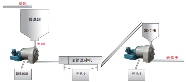 酸洗罐內(nèi)酸洗合格的石英砂和酸液一同進(jìn)入離心 脫酸機(jī),在高速離心力的作用下,酸液和石英砂分 離,酸液回收使用,而脫酸至5 - 8 %的石英砂經(jīng)滾筒 洗砂機(jī)初步水洗后送入高位槽(砂:水= 1 : 1),從 高 位 槽 底 部 出 來 的 石 英 砂 和 水 一 同 進(jìn) 入 離 心 脫 水 機(jī),在離心力的作用下,石英砂脫水至5 - 8 %,即可送入烘干機(jī)進(jìn)行烘干處理