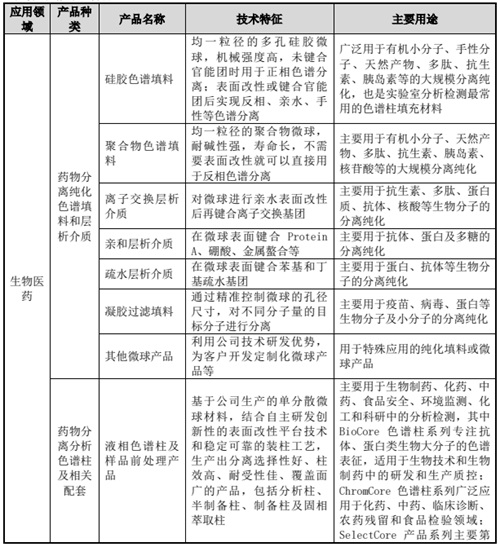 生物醫(yī)藥領域,公司主要為藥品大規(guī)模生產提供關鍵的分離純化材料,同時也為藥品質量檢測和科學研究提供分離和分析色譜柱及相關儀器設備。