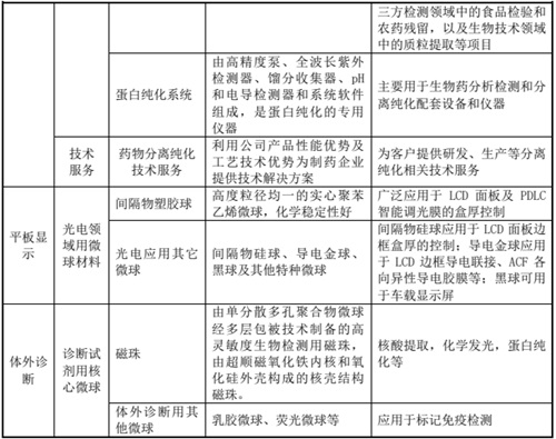平板顯示領域,公司主要產品為用于控制LCD面板盒厚的聚合物間隔物微球(間隔物塑膠球),同時可以提供包括以二氧化硅為基質的間隔物微球(間隔物硅球)、導電金球、標準顆粒、黑球等在內的其他光電應用微球材料。