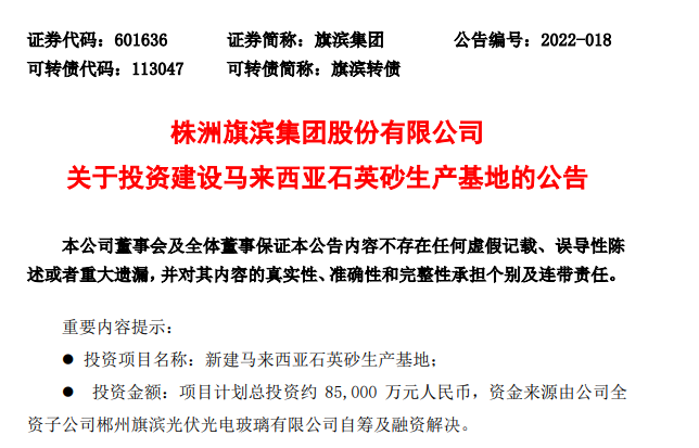 中國(guó)粉體網(wǎng)訊 3月17日,株洲旗濱集團(tuán)股份有限公司(以下簡(jiǎn)稱“旗濱集團(tuán)”)發(fā)布公告稱,為保障海外光伏玻璃生產(chǎn)線的用砂需求和供應(yīng)安全,延伸和打造一體化產(chǎn)業(yè)鏈,公司決定同步在馬來(lái)西亞沙巴州投資建設(shè)石英砂生產(chǎn)基地。