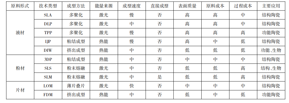 當(dāng)前主流的陶瓷增材制造技術(shù)有激光選區(qū)燒結(jié)(SLS)、激光選區(qū)熔化(SLM)、三維噴印(3DP)、熔融沉積制造(FDM)、分層實體制造(LOM)、立體光固化(SL)、數(shù)字光處理(DLP)和直寫成形(DIW)等,這些技術(shù)在機械、電子、航空航天、生物醫(yī)療等領(lǐng)域用高性能陶瓷制造方面具有廣闊的應(yīng)用前景。下表為各增材制造技術(shù)的特點及主要應(yīng)用。
