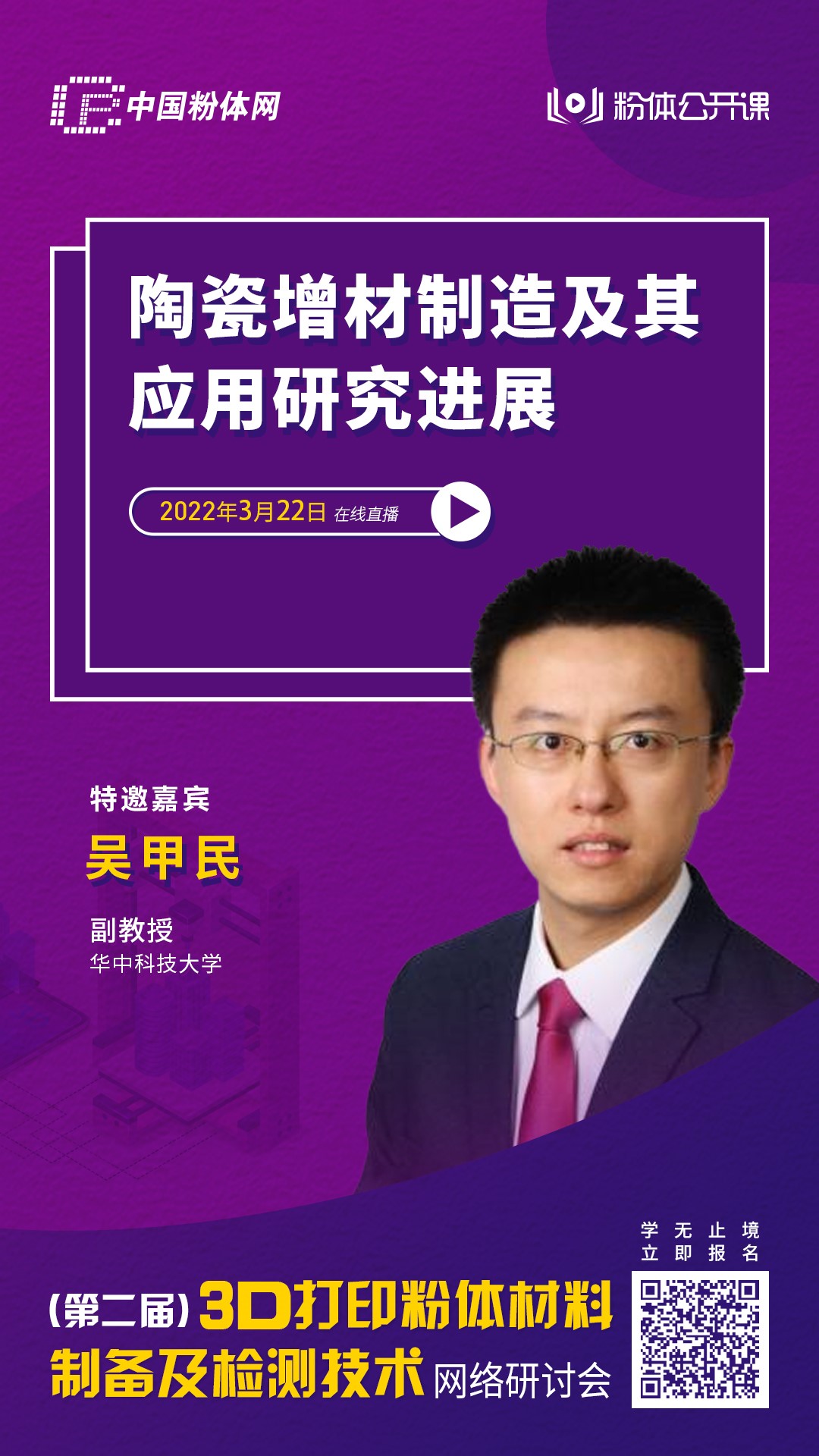 2022年3月22日,中國粉體網(wǎng)旗下粉體公開課平臺將舉辦“第二屆3D打印粉體材料制備及檢測技術(shù)網(wǎng)絡(luò)研討會”。屆時將邀請華中科技大學(xué)的吳甲民副教授作《陶瓷增材制造及其應(yīng)用研究進展》的報告。本報告重點介紹華中科技大學(xué)史玉升教授團隊近年來在陶瓷增材制造及其應(yīng)用方面的最新研究成果;诠夤袒⒓す膺x區(qū)燒結(jié)等主流陶瓷增材制造工藝,開發(fā)出多款陶瓷增材制造裝備并實現(xiàn)商品化生產(chǎn);制造出生物陶瓷、陶瓷型芯用硅基陶瓷、氮化硅等非氧化物陶瓷和微波介質(zhì)陶瓷等多種結(jié)構(gòu)和功能陶瓷,并介紹其在航空航天、生物醫(yī)療等方面的應(yīng)用。