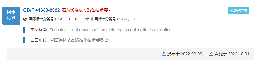 《石灰煅燒成套裝備技術(shù)要求》(GB/T 41333-2022)規(guī)定了石灰煅燒成套裝備的裝備構(gòu)成及基本參數(shù)、要求、安全和環(huán)保、安裝驗(yàn)收和調(diào)試、性能測(cè)試、交付文件等。