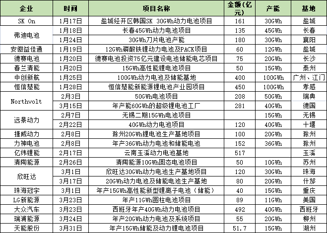 2022年第一季度全球主要動力、儲能電池投擴產(chǎn)項目