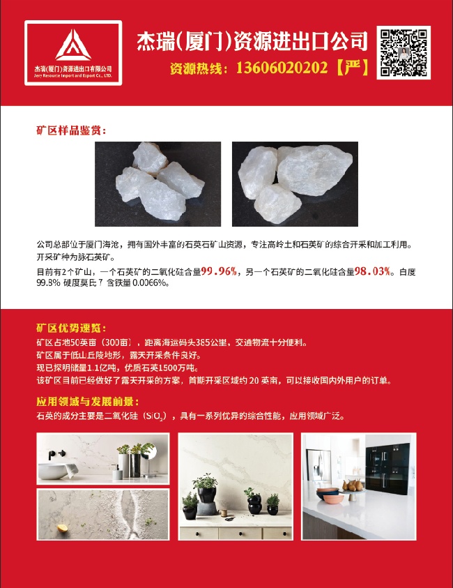 杰瑞(廈門(mén))資源進(jìn)出口公司,公司總部位于廈門(mén)海滄,擁有國(guó)外豐富的石英石礦山資源,專(zhuān)注高嶺土和石英礦的綜合開(kāi)采和加工利用。
