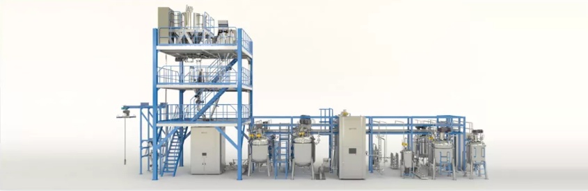 批次連續(xù)混料工藝基于混合分散機,將稱重好的粉體連續(xù)浸潤到液體中,預(yù)混合、捏合、精細(xì)分散等基本操作集中于單個設(shè)備。