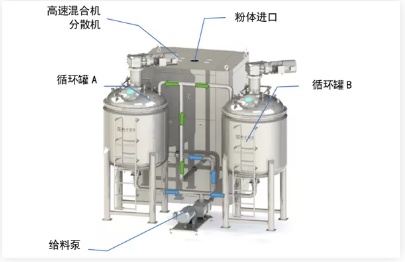 另一方面,批次連續(xù)喂料工藝粉體在真空條件下脫出部分氣體,并且被打散成彌散狀態(tài),然后進入快速流動的液體中,被浸潤并進一步分散到液體中,通常90分鐘內(nèi)可以加工完成一批漿料。