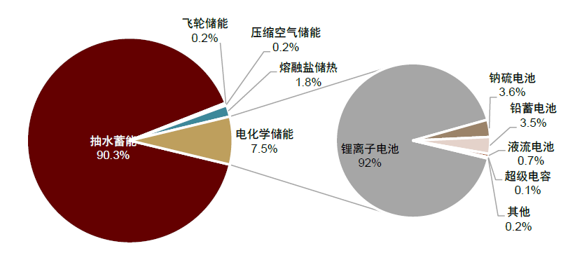 目前抽水蓄能占主導地位,電化學儲能快速增長。