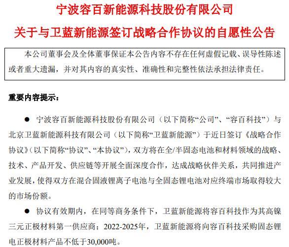 中國粉體網(wǎng)訊 4月26日晚間,容百科技公告,公司與衛(wèi)藍(lán)新能源于近日簽訂《戰(zhàn)略合作協(xié)議》,雙方將在全/半固態(tài)電池和材料領(lǐng)域的戰(zhàn)略、技術(shù)、產(chǎn)品開發(fā)、供應(yīng)鏈等開展全面深度合作。協(xié)議有效期內(nèi),在同等商務(wù)條件下,衛(wèi)藍(lán)新能源將容百科技作為其高鎳三元正極材料第一供應(yīng)商,2022~2025年采購固態(tài)鋰電正極材料產(chǎn)品不低于30000噸。