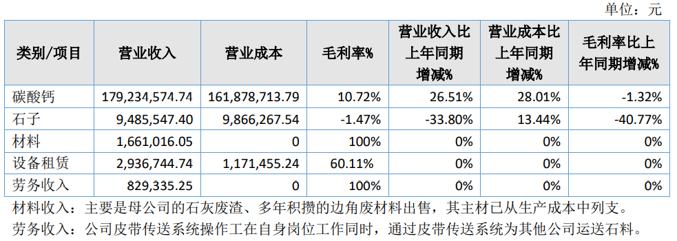 報告期內(nèi),碳酸鈣營業(yè)收入179,234,574.74元,毛利率為10.72%,營業(yè)收入比上年同期增減26.51%,毛利率比上年同期增減-1.32%;石子營業(yè)收入為9,485,547.40元,毛利率為-1.47%,營業(yè)收入比上年同期增減-33.80%,毛利率比上年同期增減-40.77%。