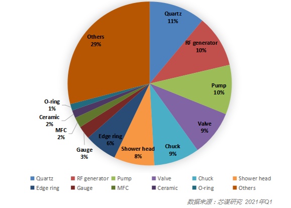 2020年,中國大陸晶圓線8吋和12吋前道設(shè)備零部件(parts)采購金額超過10億美元。如果排除三星、海力士、臺積電等境外廠商在中國大陸的產(chǎn)線,中國本土晶圓制造廠商(主要包括中芯國際、華虹集團(tuán)、華潤微電子、長江存儲等)采購金額(口徑統(tǒng)一為8吋和12吋前道設(shè)備零部件,后文同)約為4.3億美元。中國晶圓制造廠商采購的設(shè)備零部件主要有石英(Quartz)、射頻發(fā)生器(RF Generator)、各種泵(Pump)等,占零部件采購金額的比重達(dá)到或超過10%。此外,各種閥門(Valve)、吸盤(Chuck)、反應(yīng)腔噴淋頭(Shower Head)、邊緣環(huán)(Edge Ring)等零部件的采購占比也比較高。