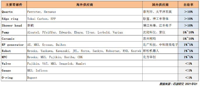 8-12吋晶圓設(shè)備部分零部件供應(yīng)商及自給率情況