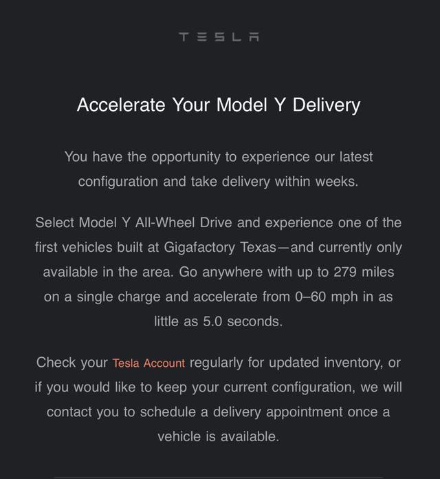 特斯拉給得州工廠附近的Model Y預(yù)定用戶發(fā)送郵件,告知他們可以修改訂單,選擇新款Model Y全輪驅(qū)動(dòng)版(AWD),體驗(yàn)在得州工廠制造的首批汽車之一。不過,特斯拉并未告知具體的交付時(shí)間,只提到會(huì)在幾周后開始交付。