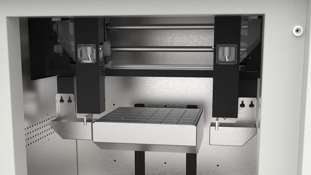 雙噴嘴功能描述:兩個獨立噴嘴各司其職,同步進行完全相同的打印運動。雙噴嘴復制打印兩個產(chǎn)品比單噴嘴打印兩個產(chǎn)品的時間縮短了一半。