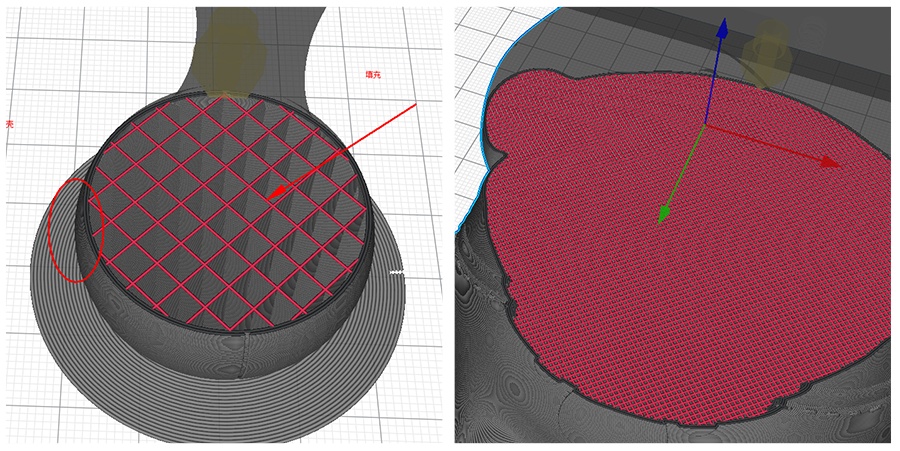 下圖中,產(chǎn)品模型外殼由材料A打印,填充由材料B打印。