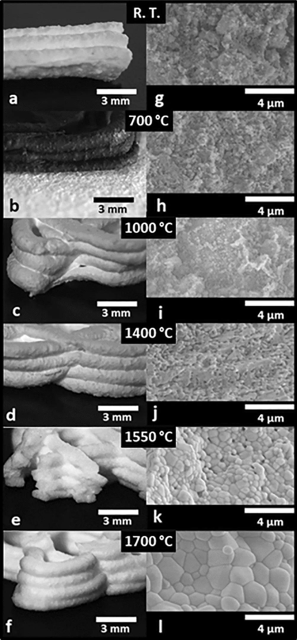 然后在不同的溫度下對打印出來的纖維結(jié)構(gòu)進行煅燒,以監(jiān)測異構(gòu)凝膠向YAG陶瓷結(jié)晶的轉(zhuǎn)化。通過這個過程,該團隊證明了在1550-1700℃的熱處理后燒結(jié)并獲得粘性陶瓷片的可能性。