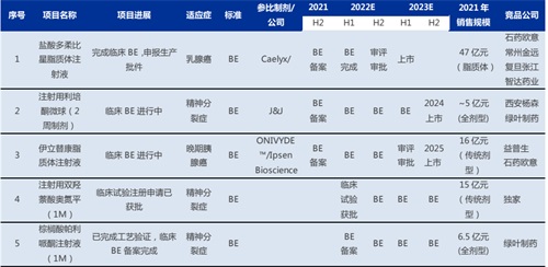 目前公司已有1個(gè)產(chǎn)品完成了BE試驗(yàn);4個(gè)產(chǎn)品進(jìn)入臨床BE階段(包括已完成備案但暫未開展試驗(yàn)的產(chǎn)品)。其中進(jìn)度最快的鹽酸多柔比星脂質(zhì)體注射液已遞交了上市申請(qǐng),注射用利培酮微球和伊立替康脂質(zhì)體注射液均處于BE階段,均有望于2023~2024年陸續(xù)完成。注射用雙羥萘酸奧氮平和棕櫚酸帕利哌酮注射液于2022年相繼獲批臨床BE,但目前還未開展。目前公司在研管線中有8個(gè)產(chǎn)品進(jìn)度靠前,預(yù)計(jì)有望于2023年開始陸續(xù)將產(chǎn)品推向市場(chǎng),公司即將進(jìn)入業(yè)績(jī)的收獲期。
