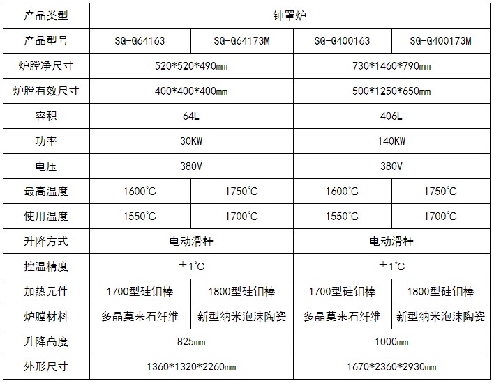 鐘罩爐為周期性作業(yè)高溫?zé)Y(jié)爐,設(shè)計(jì)應(yīng)用于電子陶瓷、氧化鋯陶瓷、 氧化鋁陶瓷、介質(zhì)陶瓷、磁性材料、納米材料等的高溫?zé)Y(jié)生產(chǎn),以及特種陶瓷靶材產(chǎn)品的預(yù)燒和燒結(jié)處理,高純石英、 藍(lán)寶石等退火工藝。該電爐爐膛采用多晶莫來(lái)石纖維/優(yōu)質(zhì)新工藝納米陶瓷泡沫纖維材料拼接而成,潔凈度高,耐腐蝕,采用優(yōu)質(zhì)硅鉬棒作為加熱元件,四面加熱腔,溫場(chǎng)均勻,電動(dòng)升降機(jī)構(gòu),底座穩(wěn)固。該設(shè)備操作簡(jiǎn)便, 控溫穩(wěn)定、 溫度均勻性好、 高效節(jié)能等特點(diǎn),適用于高校、科研院所實(shí)驗(yàn)和企業(yè)批量生產(chǎn)。